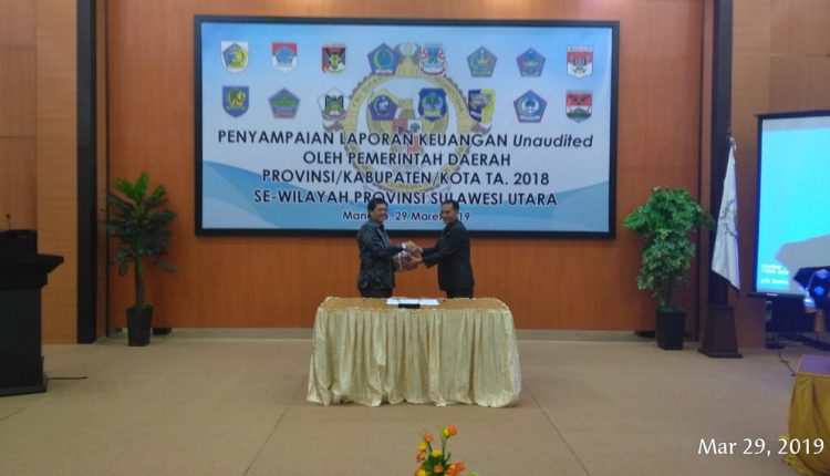 Boltim,WB- Bupati Bolaang Mongondow Timur (Boltim) melalui Sekretaris Daerah Ir. Hi Muhammad Assagaf menyerahkan Laporan Keuangan Pemerintah Daerah (LKPD) Tahun Anggaran 2018 kepada Kepala Perwakilan Badan Pemeriksa Keuangan (BPK) RI Sulawesi Utara, Tangga Muliaman Purba, di Kantor BPK Manado, Jumat (29/3).