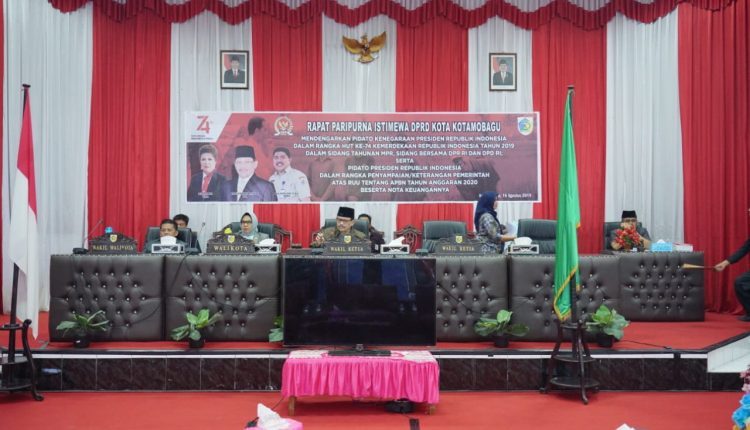 Kotamobagu,WB—Dewan Perwakilan Rakyat Daerah (DPRD) Kotamobagu, Jumat (16/8) menggelar, Rapat Paripurna Istimewa. Rapat untuk mendengarkan pidato kenegaraan yang disampaikan langsung Presiden RI Joko Widodo ini, dalam rangka HUT Kemerdekaan RI ke 74 Tahun 2019 dalam sidang tahunan MPR, sidang bersama DPR RI dan DPD RI.