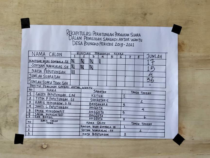 Pelaksanaan yang digelar di Aula Kantor Desa Bungko itu, turut dihadiri Wakil Walikota Kotamobagu, Nayodo Koerniawan SH, Kepala Bagian Tata Pemerintahan Marham Anas Tungkagi, Camat Kotamobagu Selatan, Hamdan Mokoagow, Sekretaris Kesbangpol Hendra Makalalag, Kapolsek Kotamobagu, serta para tamu undangan dan unsur masyarakat yang akan memilih.