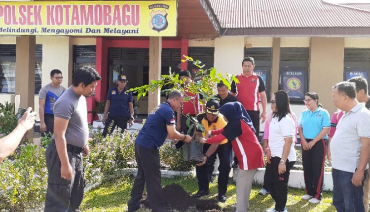 Pada kesempatan itu, Kapolsek Kotamobagu, Kompol Johan Damopolli bersama Wakapolsek AKP I Ketut Mantra, SH memimpin langsung proses penanaman pohon dengan seluruh anggota Polsek beserta Bhayangkari.
