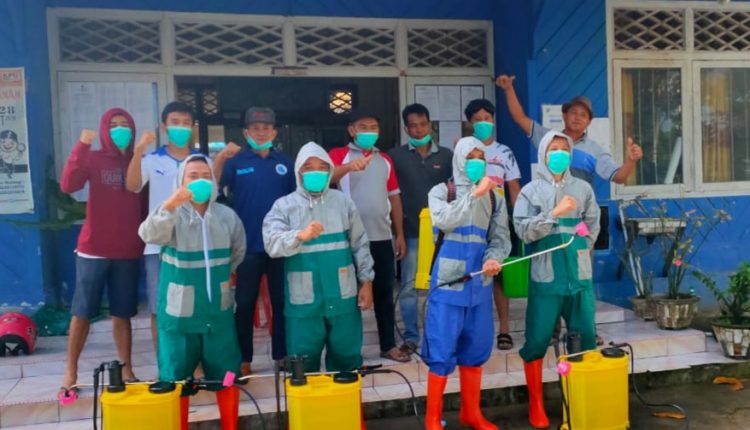 Kotamobagu,WB–Merespon keinginan warga dalam upaya pencegahan dan mengantisipasi penyebaran virus corona (Covid-19), Karang Taruna Komalig Desa Kopandakan I, Kecamatan Kotamobagu Selatan, bersama Babinkantibmas dan pemerintah desa setempat melakukan penyemprotan cairan Disinfektan, Jumat (10/4/2020).