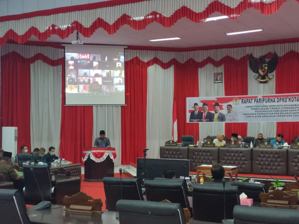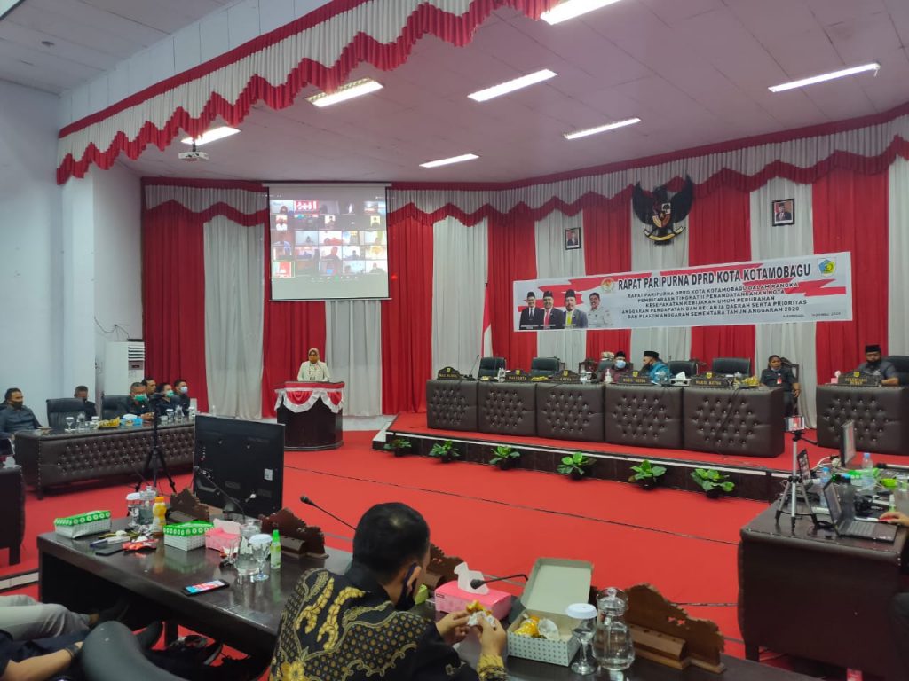 Sidang rapat paripurna ini dipimpin langsung Ketua DPRD Meydi Makalalag di dampingi Wakil Ketua DPRD Syarifudin Mokodongan dan Wakil Ketua Herdy Korompot via vicon dan dihadiri langsung Wali Kota Kotamobagu, Ir Hj Tatong Bara.