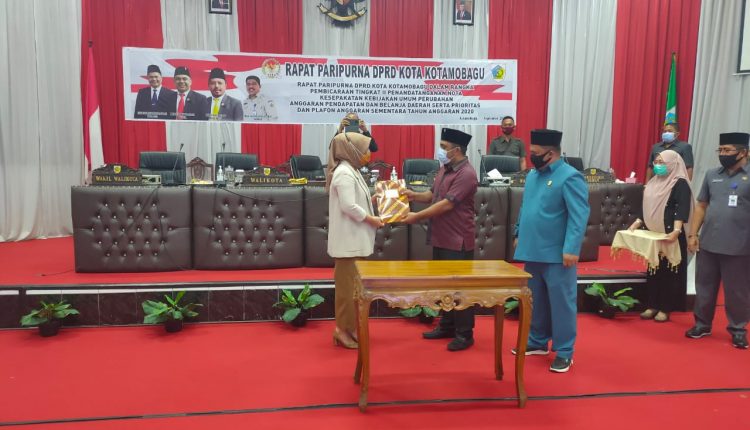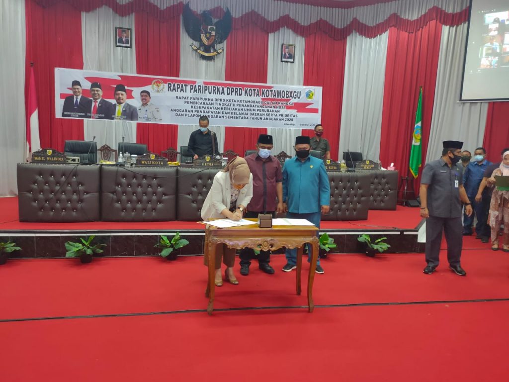 Kotamobagu,WB–Dewan Perwakilan Rakyat Daerah (DPRD) Kota Kotamobagu bersama Pemerintah Kota (Pemkot) menggelar rapat sidang paripurna dalam rangka pembicaraan tingkat II penandatanganan nota kesepakatan kebijakan umum perubahan anggaran pendapatan dan belanja daerah serta prioritas dan plafon anggaran sementara tahun anggaran 2020, Sabtu (26/09/2020) pekan lalu.
