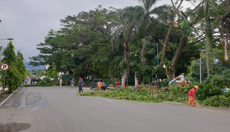 Kotamobagu,WB-Dinas Perumahan Rakyat dan Kawasan Pemukiman (PRKP) Kota Kotamobagu, melakukan pemangkasan pohon di wilayah Kota Kotamobagu, Selasa (23/2/2021).