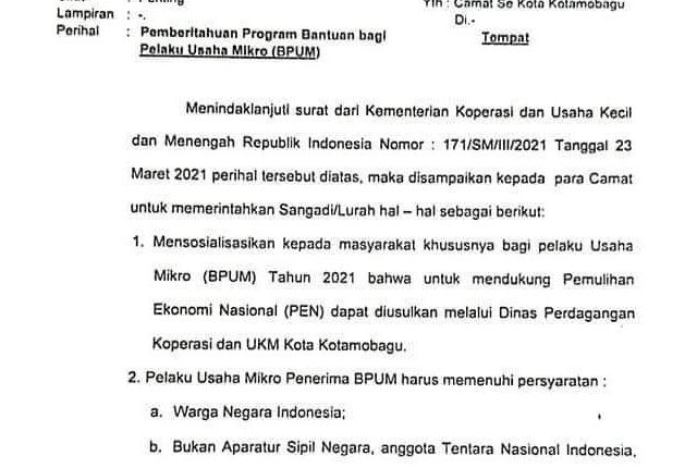 “Kepada para Camat untuk memerintahkan Sangadi / Lurah hal-hal sebagai berikut : 1. Mensosialisasikan kepada masyarakat khususnya bagi pelaku usaha mikro tahun 2021, bahwa untuk mendukung pemulihan ekonomi nasional (PEN), dapat diusulkan melalui Dinas Perdagangan Koperasi dan UKM Kotamobagu,” demikian petikan dari surat yang ditandatangani oleh Asisten I Bidang Pemerintahan dan kesejahteraan Rakyat Teddy Makalalag tersebut.