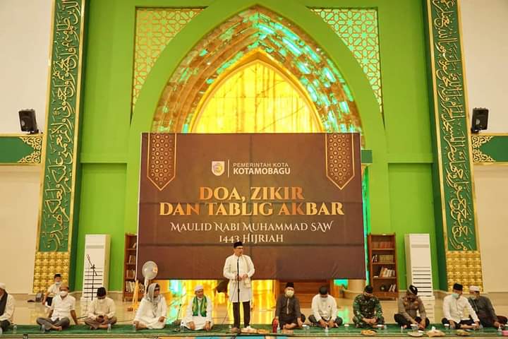 Kotamobagu,WB-Mewakili Wali Kota Kotamobagu, Wakil Wali Kota  Nayodo Koerniawan, menghadiri peringatan Maulid Nabi Muhammad SAW 1443 Hijriah di Masjid Agung Baitul Makmur (MABM) Kotamobagu,  Senin 18 Oktober 2021.