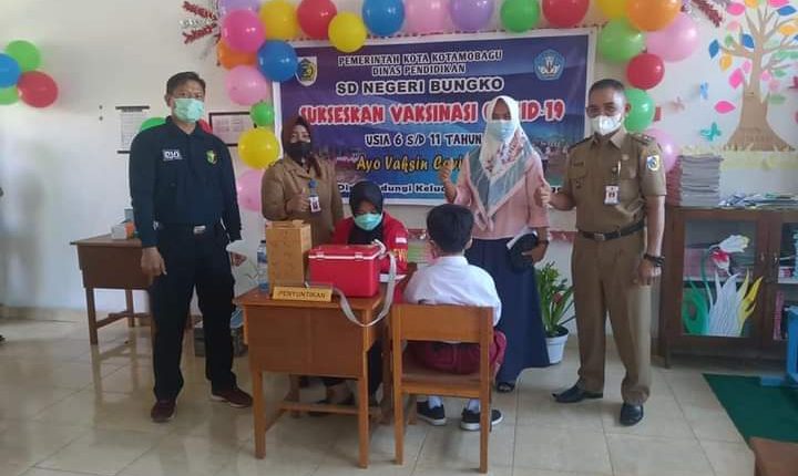 Kotamobagu,WB-Penjabat Sangadi Desa Bungko Kecamatan Kotamobagu Selatan, Saprudin Paputungan, memantau langsung pelaksanaan vaksinasi terhadap siswa usia 6 – 11 tahun, yang di gelar di SD Negeri Bungko, Selasa 18 Januari 2022 kemarin.