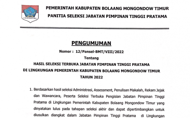 “Berdasarkan hasil seleksi Administrasi, Assessment, Penulisan Makalah, Rekam Jejak dan Wawanara, Peserta Seleksi Terbuka Pengisian Jabatan Pimpinan Tinggi Pratama di lingkungan Pemkab Boltim yang dinyatakan lulus pada tahapan seleksi akhir dan dapat dipertimbangkan untuk diusulkan diangkat dalam JPTP di lingkungan Pemkab Boltim adalah sebagaimana tercantum dalam lampiran ini,” demikian bunyi point pertama pengumuman yang ditandatangani Ketua Pansel Sonny Warokka.