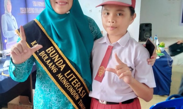 BOLTIM,WB – Bunda Literasi Kabupaten Bolaang Mongondow Timur (Boltim), Seska Ervina Budiman, memberikan penghargaan kepada salah satu siswi SD Negeri 1 Bangunan Wuwuk, Lionyta Lombogia.