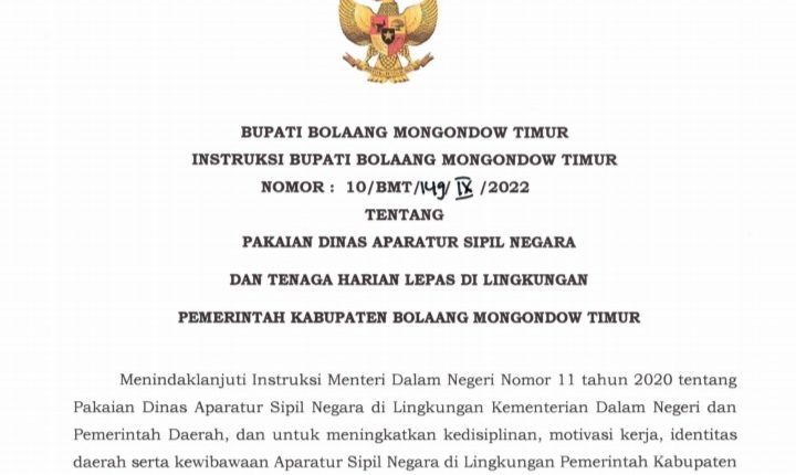 Hal ini berdasarkan surat intruksi dari Bupati Boltim, Sam Sachrul Mamonto, Nomor :10/BMT/149/IX/2022, tentang pakaian dinas ASN dan THL di lingkungan Pemkab Boltim.