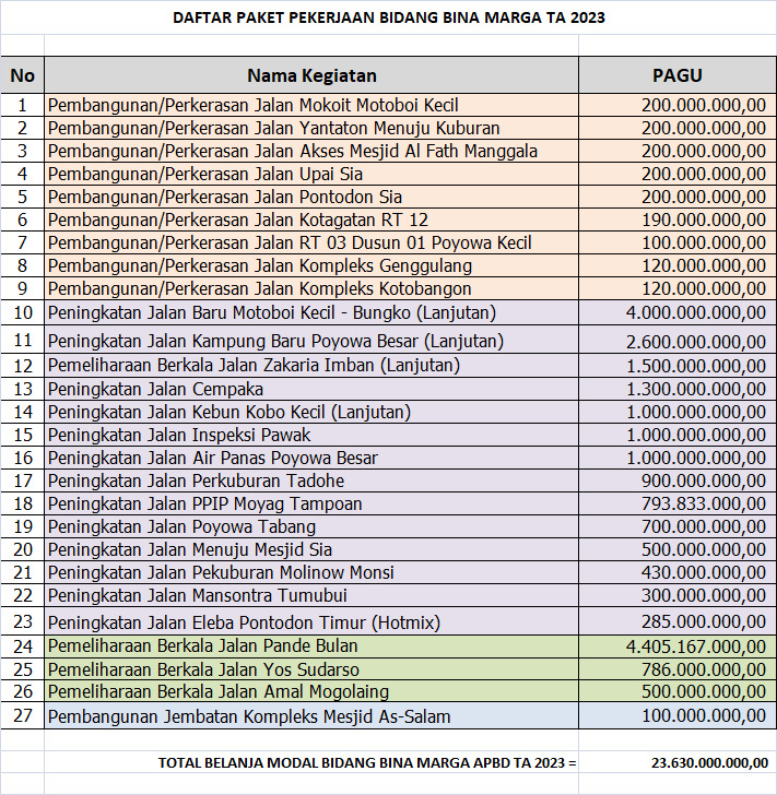 Berikut daftar paket pekerjaan Bina Marga Dinas PUPR Kotamobagu Tahun 2023.