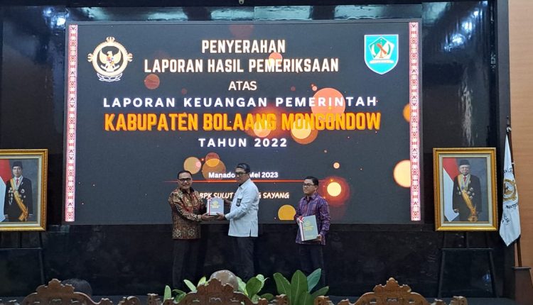 BOLMONG,WB-Badan Pemeriksa Keuangan Republik Indonesia (BPK RI) perwakilan Sulawesi Utara menyerahkan Laporan Hasil Pemeriksaan (LHP) keuangan Pemkab Bolaang Mongondow Bolmong, bertempat di Kantor BPK Manado, Senin 15 Mei 2023.