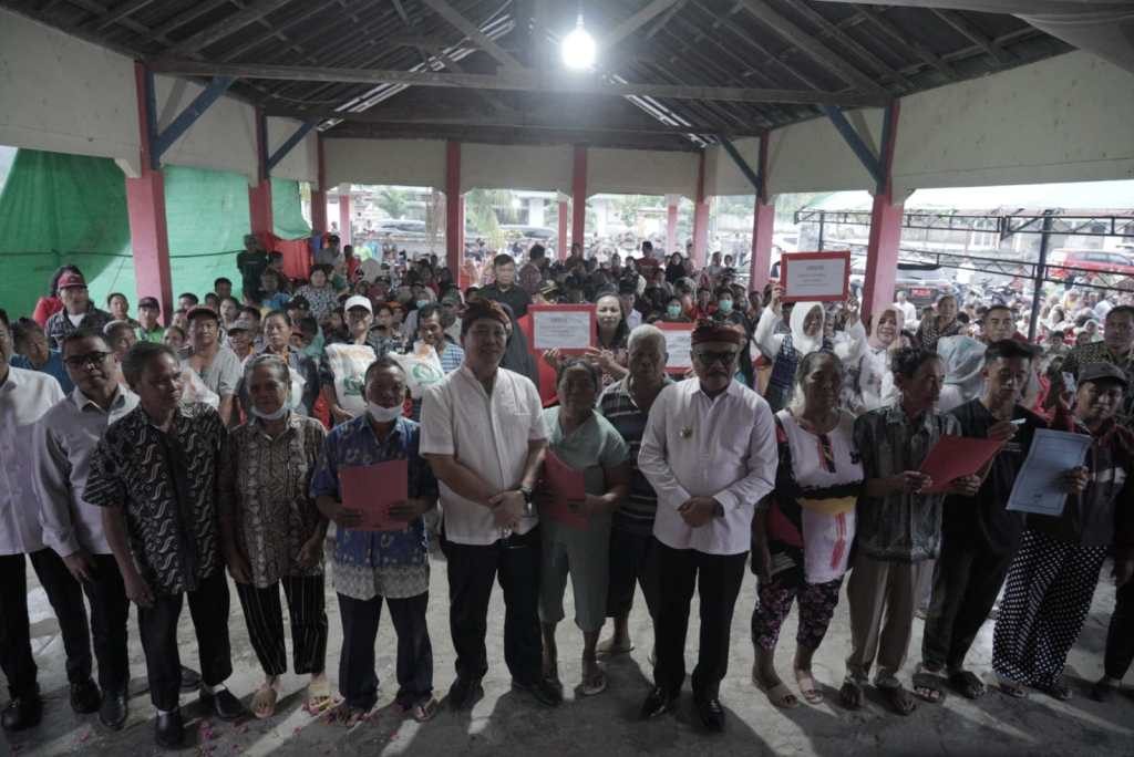 Bolmong,WB–Penjabat (Pj) Bupati Limi Mokodompit, mendampingi Wakil Gubernur (Wagub) Sulawesi Utara (Sulut) Steven Kandouw menyerahkan akta nikah kepada 100 Pasangan suami istri (Pasutri), di Balai Desa Werdi Agung, Kecamatan Dumoga Tengah, Kabupaten Bolaang Mongondow (Bolmong), Sabtu (21/10).