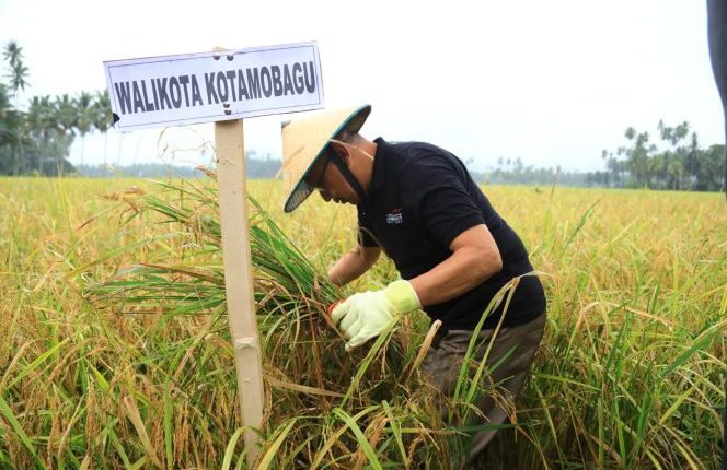 KOTAMOBAGU,WB-Penjabat (Pj) Wali Kota Kotamobagu, Asripan Nani, lakukan kegiatan panen padi di persawahan Desa Bungko, Kecamatan Kotamobagu Selatan, Senin 1 Juli 2024.