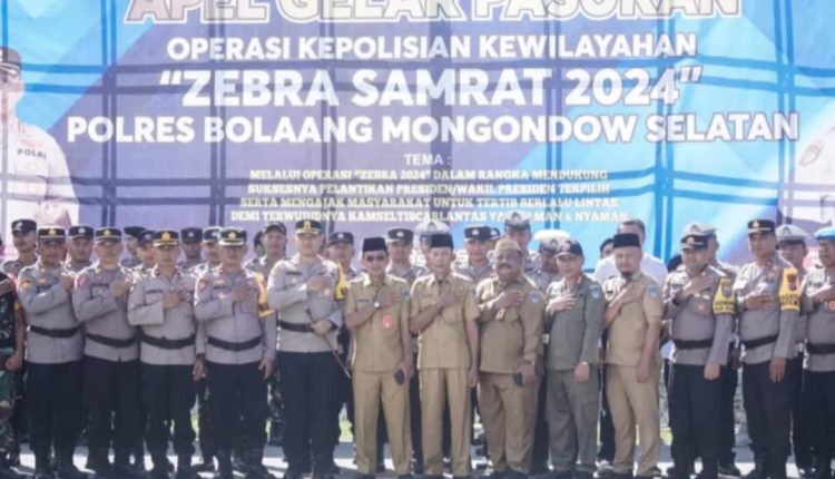 BOLSEL,WB-Pjs. Bupati Bolaang Mongondow Selatan (Bolsel), Tahlis Gallang, diwakili Asisten II Setda Bidang Ekonomi dan Pembangunan M. Ichsan Utiah SH mengikuti Apel Gelar Pasukan Operasi Zebra Samrat 2024 Polres Bolsel di lapangan Apel Mapolres Bolsel, Desa Tabilaa Kecamatan, Bolaang Uki, Senin 14 Oktober 2024.