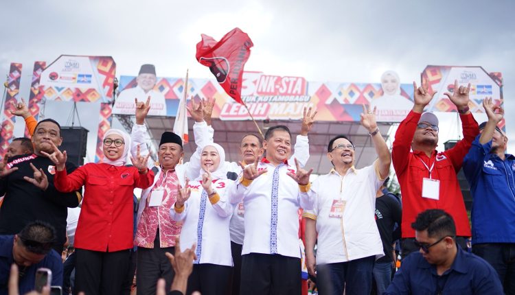 KOTAMOBAGU,WB-Cuaca hujan tak menghalangi semangat ribuan pendukung calon Wali kota yang hadir dalam kampanye akbar Calon Walikota Kotamobagu Nayodo Koerniawan-Sri Tanti Angkara (NK-STA) yang berlangsung di Lapangan Bonobokan, Kelurahan Molinow, Kecamatan Kotamobagu Barat, Kota Kotamobagu, Rabu 20 November 2024.